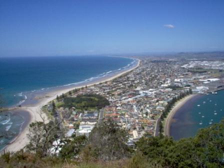 Mauao (Mt. Maunganui) looking down - Bay of Plenty on the left Tauranga Harbour on the right. NZ 2006